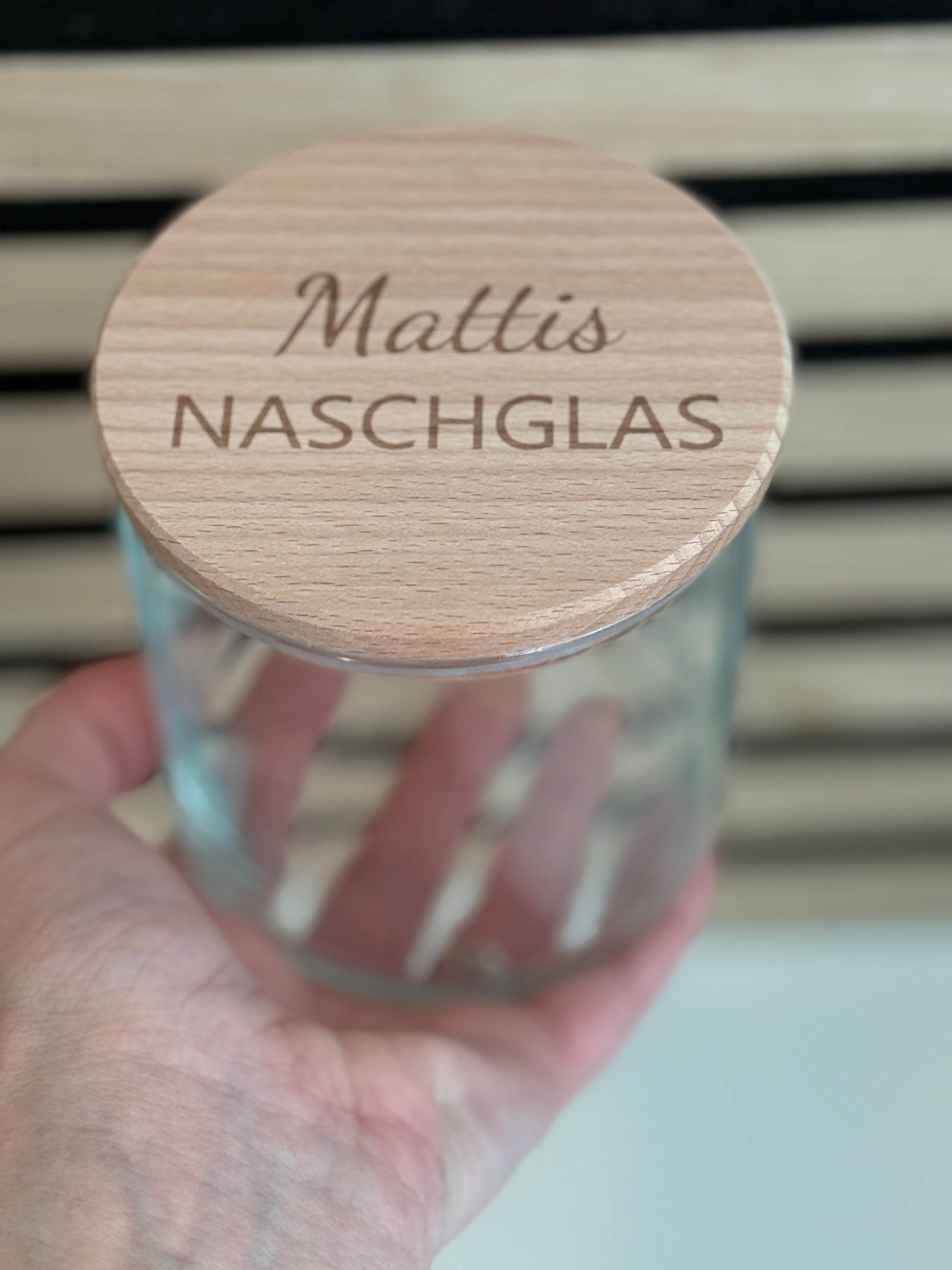 Naschglas mit Deckel – mit graviertem Holzdeckel für Familie, Freunde, Kinder oder Vierbeiner