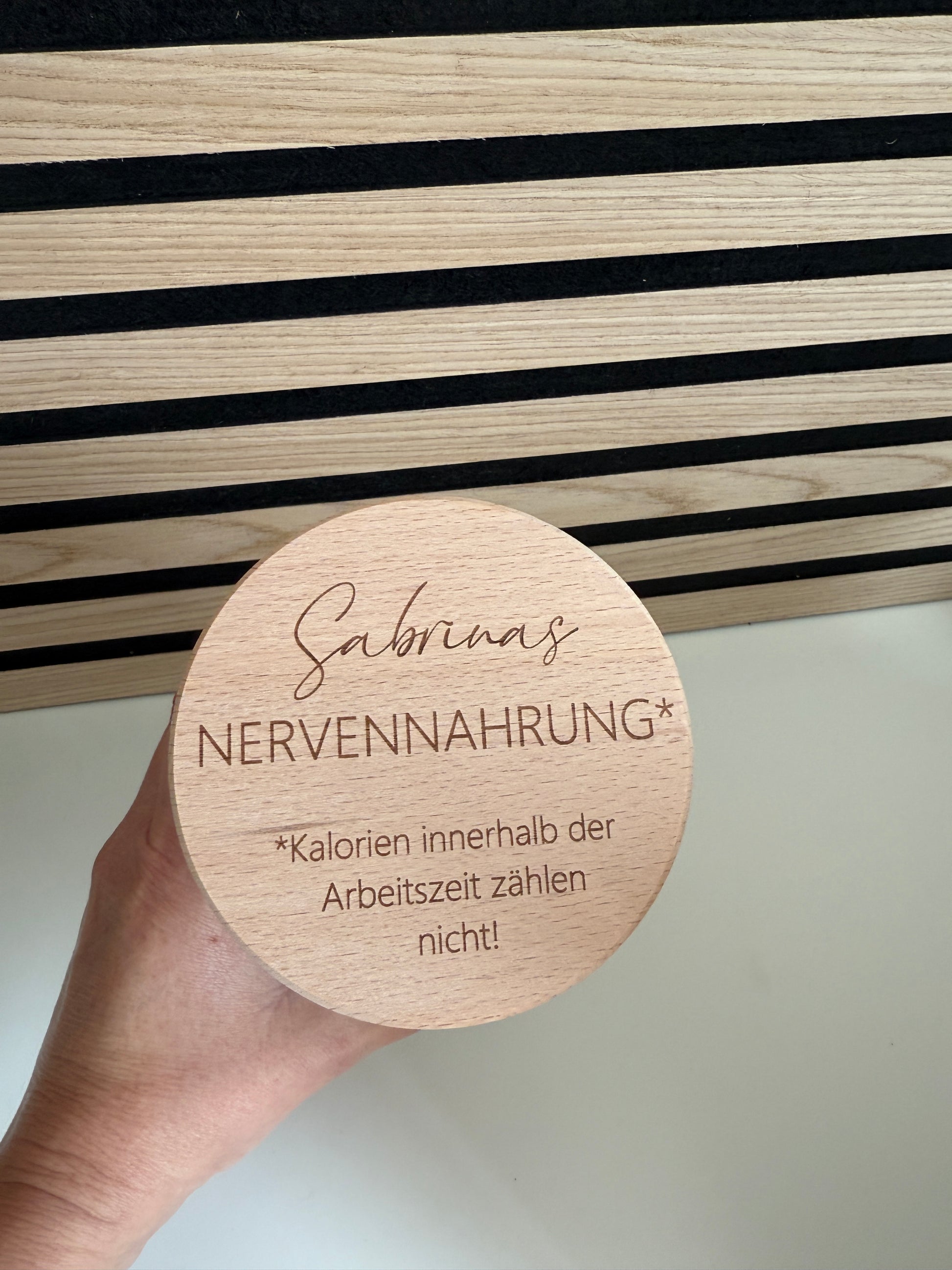 Nervennahrung im Glas mit Deckel – mit graviertem Holzdeckel für Familie, Freunde, Kinder oder Vierbeiner